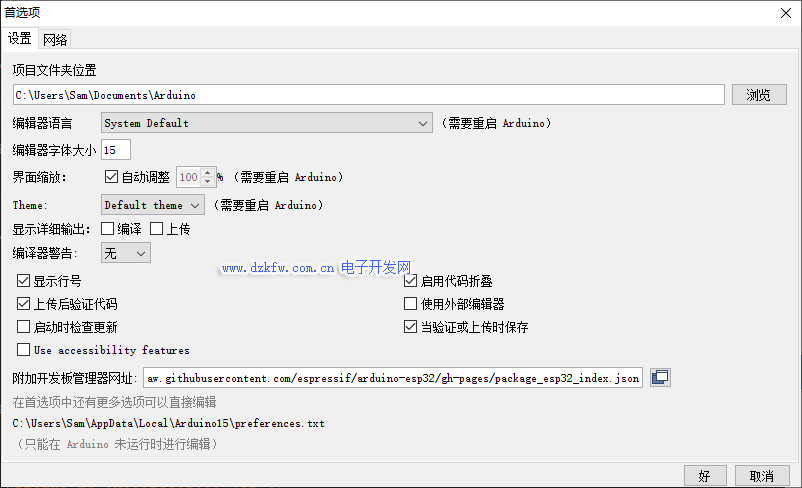 依次打開菜單-》文件-》首選項。把下面網址粘貼到 *附加開發板管理網址 中: