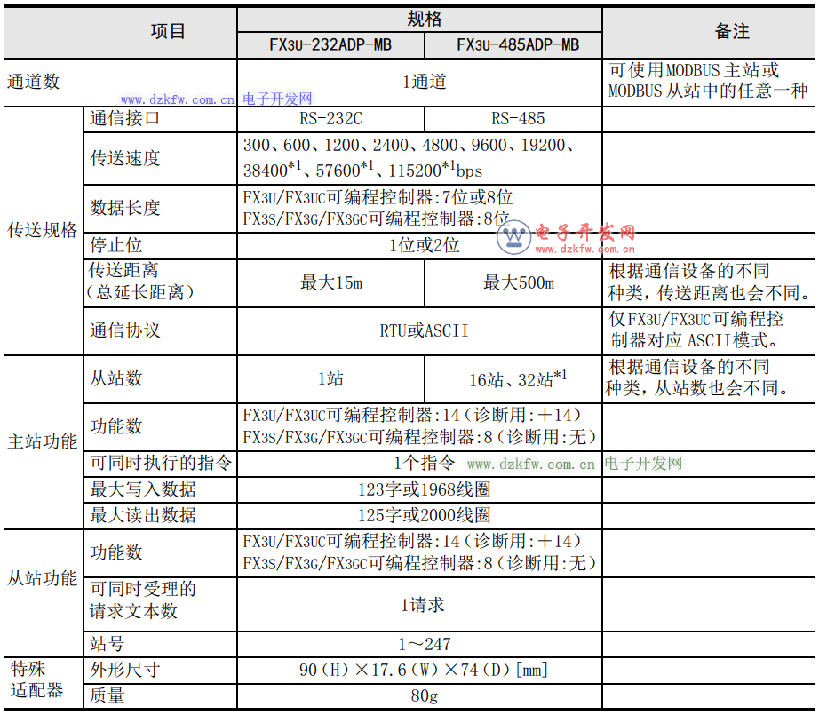 MODBUS通信根據與可編程控制器連接的特殊適配器(FX3U-232ADP-MB或FX3U-485ADP-MB)的下列規格執行