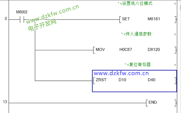 在初始化程序中需要將M8161設置為處理低8位數據模式(M8161=ON),將通信參數傳入特殊寄存器D8120以及復位程序中用到的寄存器。