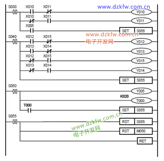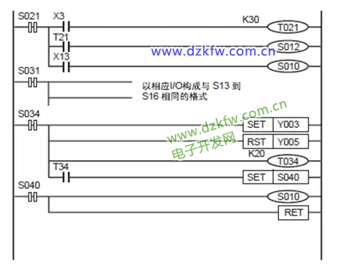 可以注意到本程序是以梯形圖或STL形式編寫的,這對于下面要講的兩點來說時非常重要的。如果研究STL步S20和S30的內容,可看到它們都包含Y3輸出,在標準編程技術中,這叫做雙線圈輸出,是絕對不允許的。在正常編程中,如果一次出現的輸出Y3接通,而在同一次掃描中第二次出現時復位此輸出,從而導致一種很危險的情況。不過,因為STL編程每一個STL步的程序相對獨立,輸出線圈在許多STL塊中的使用是很安全的,從而使編程更簡單。