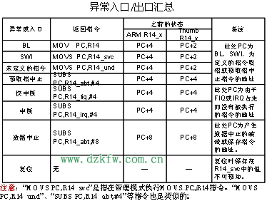 注:異常總是在ARM狀態(tài)中進(jìn)行處理。當(dāng)處理器處于Thumb狀態(tài)時發(fā)生了異常,在異常向量地址裝入PC時,會自動切換到ARM狀態(tài)。