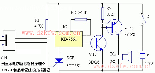 電路原理見圖SCR、R1和AN組成可控硅觸發(fā)開關(guān)電路;IC1、R2、VT1、VT2和BL組成模擬警笛聲電路。平時(shí),AN受到家用電器的壓迫,使其兩常閉觸點(diǎn)斷開,SCR無觸發(fā)信號(hào)而阻斷,報(bào)警器不工作。當(dāng)家用電器被搬起時(shí),AN兩觸點(diǎn)自動(dòng)閉合,SCR的觸發(fā)端經(jīng)R1從電源正極獲得觸發(fā)信號(hào),SCR導(dǎo)通,IC1通電工作,其輸出端輸出的警笛聲電信號(hào)經(jīng)VT1、VT2功率放大,推動(dòng)揚(yáng)聲器發(fā)出宏亮的報(bào)警聲。此時(shí),即使將家電放回原處或破壞掉AN,也無法阻止報(bào)警聲。只有主人打開與報(bào)警器安裝在一起且其他人一時(shí)很難找到的開關(guān)S,才能解除報(bào)警。