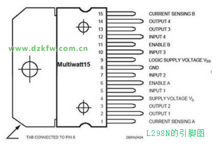 L298N內(nèi)部的組成其就是上面講的H橋驅(qū)動電路,所以工作原理我以上介紹的H橋相同,這里我們不在敘述,在使用時重點要了解其引腳的功能和主要的性能參數(shù)。引腳圖如圖12所示。
