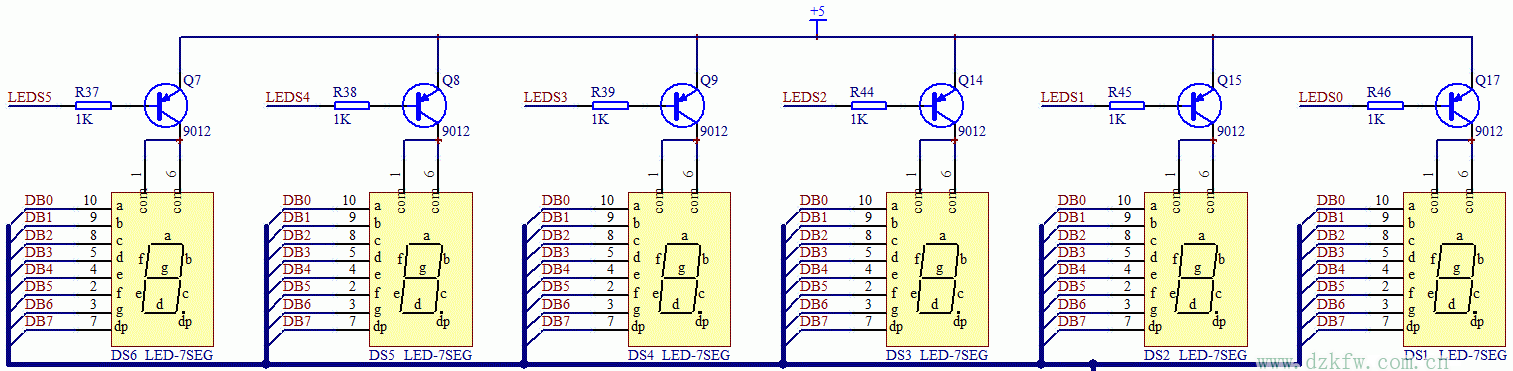 他們的com是接到了正極上,當然了,和LED小燈電路類似,也是由74HC138控制了三極管的導通來控制整個數碼管的電流,我們先來看DS1這個數碼管。原理圖上可以看出來,控制DS1的三極管是Q17,控制Q17的引腳是LEDS0,對應到74HC138上邊就是Y0端的輸出。