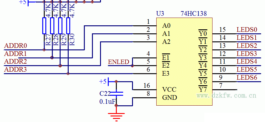 我們現在的目的是讓LEDS0這個引腳輸出低電平,相信大家現在可以獨立根據前邊學到的內容把ADDR0,ADDR1,ADDR2,ADDR3,ENLED這4個輸入狀態寫出來,現在大家不要偷懶,都去根據138的手冊去寫一下,不需要你記住這些結論,但是遇到就寫一次,鍛煉過幾次后,遇到同類芯片自己就知道如何去解決問題了。