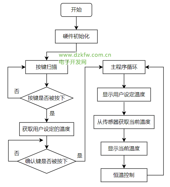 - 進行一次恒溫控制后,系統又回到主程序循環的起始點,不斷重復上述3-5步驟,使溫度保持在用戶設定的溫度,達到恒溫的效果。