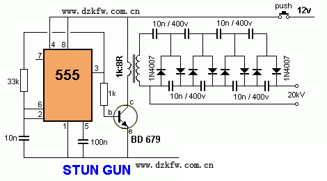 該電路產(chǎn)生一個(gè)非常高的電壓,必須謹(jǐn)慎使用,以防止電擊。變壓器可以產(chǎn)生超過1000V和8級(jí)倍壓器,可以生產(chǎn)多達(dá)20KV直流高壓電。