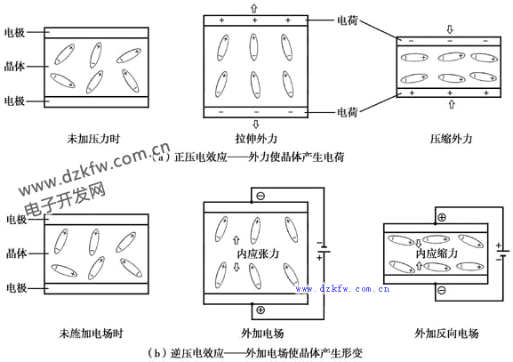 根據(jù)圖1-2所示,對石英晶體施加的力方向不同時(shí),其產(chǎn)生的電壓極性也不同;對石英晶體施加電壓的極性不同時(shí),其產(chǎn)生的機(jī)械應(yīng)力(變形)也不同。另外,若施加的力消失,石英晶體就會復(fù)原;施加的電壓消失,石英晶體產(chǎn)生的機(jī)械應(yīng)力也隨之消失。