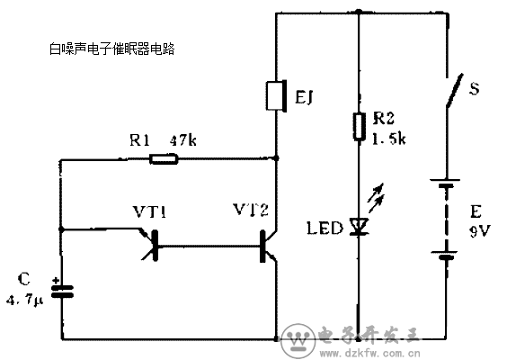 白噪聲催眠器的電路如圖2所示。接通電源后,電流經過電阻R1向電容C充電,VT1作為穩壓管,其內部發生的噪聲電流(電子無規則運動所產生)經三極管VT2放大后由耳機BE輸出,發出柔和的“咝咝”輕微響聲,能催人入眠。