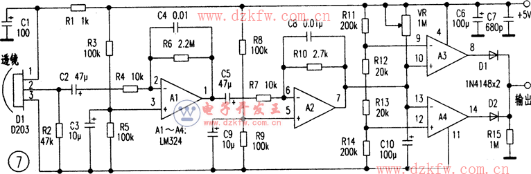 現在市場上,人體感應模塊的電路組成形式有多種多樣的,既有專用芯片電路,也有用通用型運算放大器芯片實現的。由于目前的專用芯片性能不一定比通用的運算放大器芯片制作的感應模塊好、加之價格也比較高。所以,筆者在今后的文中。以采用通用的LM324運算放大器,作為實現人體紅外線感應模塊功能的放大器芯片電路。