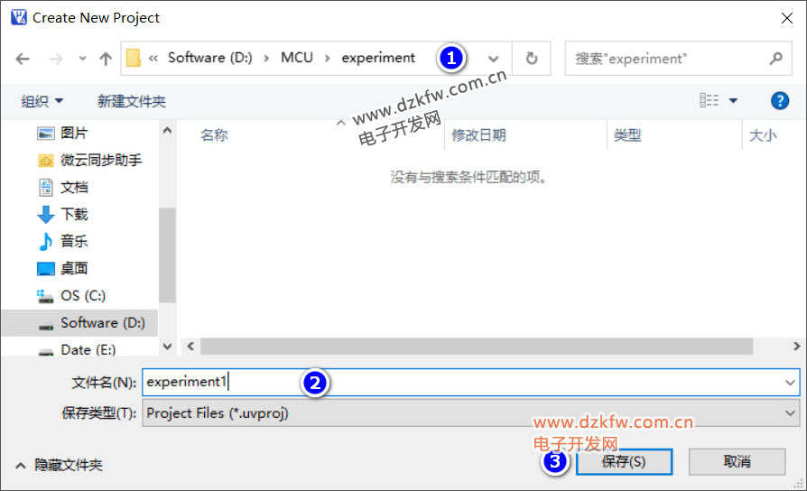 ① 是當前路徑,我們在 ② 處填上我們要建立的 keil 工程名字: experiment1,點擊 ③ 保存。