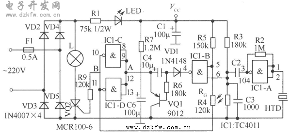 如圖所示為改進(jìn)型聲光控開關(guān),延時(shí)時(shí)間延長(zhǎng)至3min左右,能很好地滿足用戶的使用要求,并且如果在使用時(shí)想繼續(xù)延長(zhǎng)延時(shí)時(shí)間,可以在燈泡發(fā)光時(shí)再擊一下掌(發(fā)聲)即可,使用起來(lái)更加方便。元器件選擇IC1要選用雙輸入四與非門TC4011。RG為光敏電阻,亮電阻阻值與暗電阻阻值相差越大效果越好。電阻采用1/8W碳膜電阻。電解電容耐壓為16V,C6應(yīng)選用性能好、漏電電阻值大的電解電容。電路中各元件參數(shù)見原理圖中的標(biāo)識(shí)。樓道感應(yīng)燈電路圖: