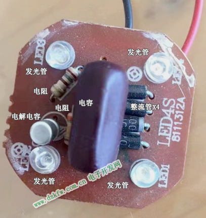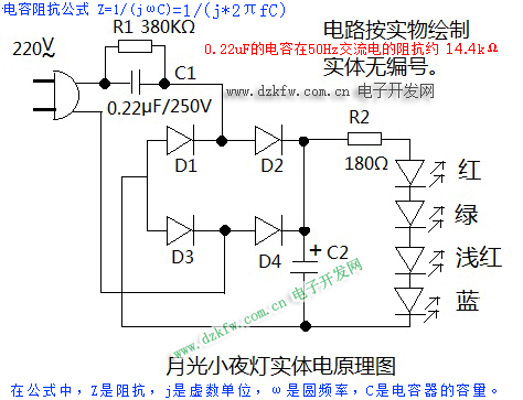 一只月光小夜燈,五彩繽紛,惹人喜愛。名稱叫“夜光”,但黑夜里感覺太亮。因為功耗不大,24小時不關,終究還是將夜燈的插頭燒壞了。于是拆機研究一下。實體圖和電原理圖如下。