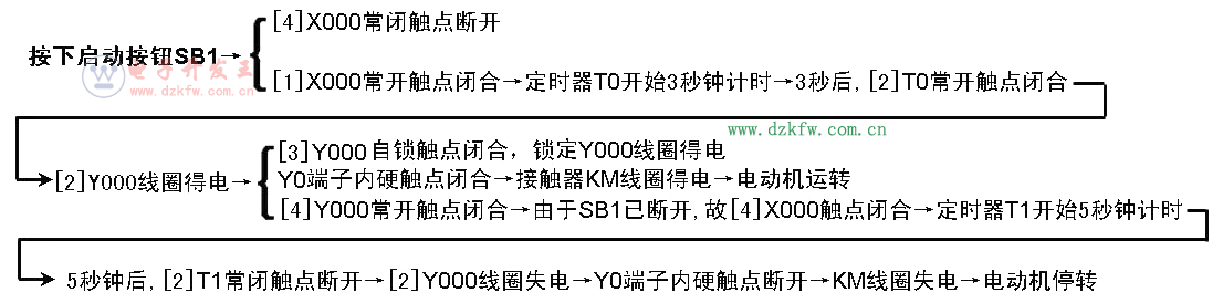 延時起動定時運行控制的plc線路與梯形圖它可以實現的功能是:按下起動按鈕3秒鐘后,電動機起動運行,運行5秒鐘后自動停止。PLC線路與梯形圖說明如下: