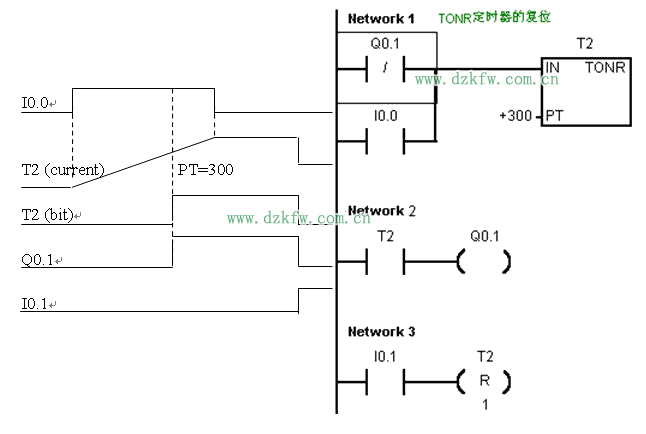 (2) 有記憶接通延時定時器TONR——一般用于累計許多時間間隔(指令功能及時序圖見教材P222:Fig8-3-3c)