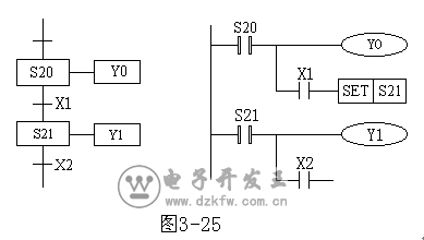狀態轉移圖中的每一步包含三個內容:本步驅動的內容,轉移條件及指令的轉換目標。如圖1中S20步驅動Y0,當X1有效為ON時,則系統由S20狀態轉為S21狀態,X1即為轉換條件,轉換的目標為S21步。