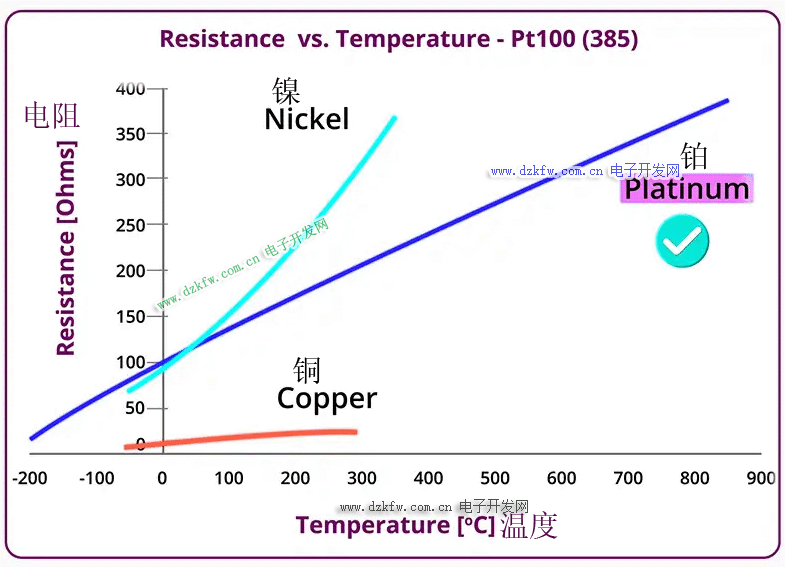 其中α=0.00392,Ro為100Ω(在0℃的電阻值),T為攝氏溫度,因此鉑做成的電阻式溫度傳感器,又稱為PT100。