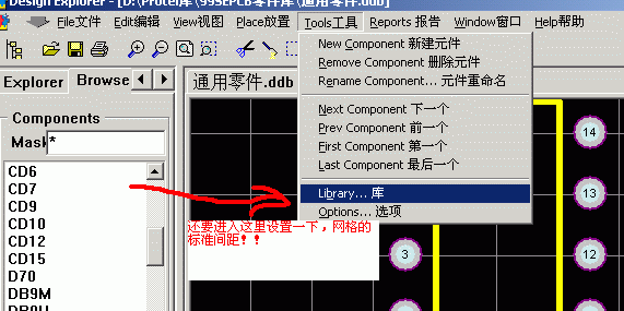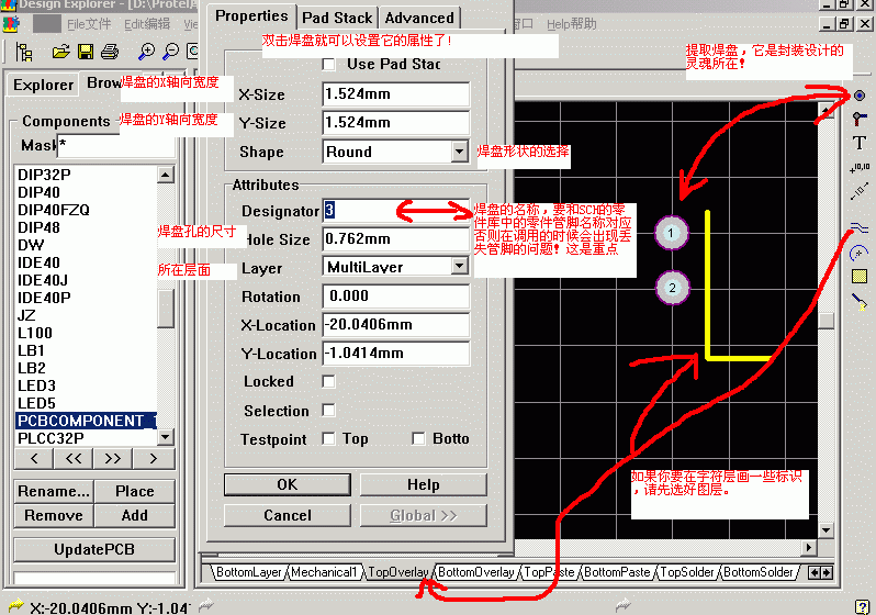 9.可以開始做封裝了,注意哪些中文注釋,核心問題就是焊盤的名稱,但愿你還記得做SCH零件的重點>>
