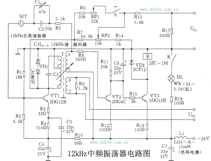 工作原理:12kHz中頻振蕩器由12kHz石英振蕩器、輸出電平調整、電平提升電路以及告警電路所組成。它采用新穎單管調諧變量器反饋式振蕩電路,在反饋回路中,串接了12kHz石英晶體諧振器,從而使振蕩頻率取決于l2kHz石英晶體諧振器的性能。在提高振蕩器可靠性及輸出幅度穩定性方面,采用了交流穩幅電路。