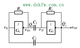 v1有微小的正跳變,則由于“非”門工作在放大區,且電路具有正反饋環,迅速使G1飽和導通,