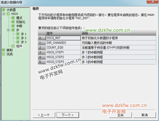 點擊向導對話框左側樹形目錄中的選項“組件(Components)”可以看到此時向導生成的子程序和中斷程序名稱及描述,點擊“生成(Generate)”按鈕,完成向導。