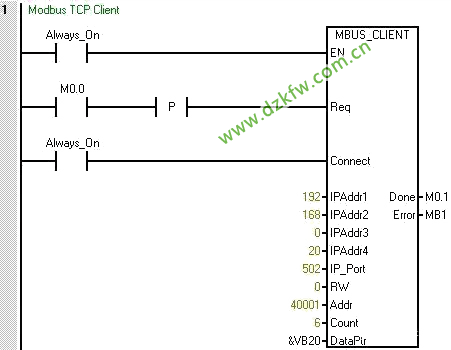 程序執行周期每次掃描都必須調用 MBUS_CLIENT,直到 Done 輸出為 TRUE。在每個周期中,MBUS_CLIENT 均會退出,以便程序可以繼續運行?蛻舳送瓿烧埱髸r,MBUS_CLIENT 將 Done 設置為 TRUE。