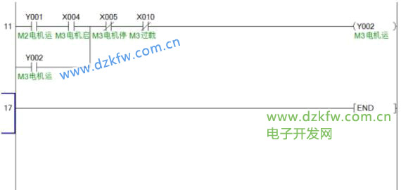 在需求中提到停止不做要求,因此三臺(tái)電動(dòng)機(jī)只要按下各自的停止按鈕就能停止。當(dāng)按下X001,Y000斷電,電機(jī)M1停止;按下X003,Y001斷電,電機(jī)M2停止;按下X005,Y002斷電,電機(jī)M3停止。在電機(jī)過(guò)載時(shí),過(guò)載的電機(jī)就會(huì)停止運(yùn)行。