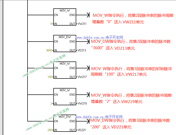 在多段管道模式下,系統(tǒng)仍使用特殊存儲器區(qū)的相應控制字節(jié)和狀態(tài)位,每個脈沖串的參數(shù)則從包絡表的變量存儲器區(qū)讀出,在多段管道編程時,必須將包絡表的變量存儲器起始地址(即包絡表中的n值)存入SMW168或SMW178中,在包絡表中的所有周期值必須使用同一個時間單位,而且在運行時不能改變包絡表中的內(nèi)容,執(zhí)行PLS指令來啟動多段管道操作。