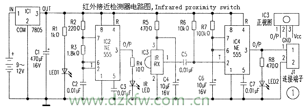 在附近移動的物體反射由紅外線LED射出的紅外線。紅外線接收模塊的靈敏度角約為0-60°。因此,當反射的紅外線被檢測到時,IC4被觸發(fā),其 輸出信號可以以任何需要的方式使用。例如,當有人接近時,通過繼電器吸合來接通一照明燈。在此人離去幾秒鐘(單穩(wěn)時間)后就自動關斷。