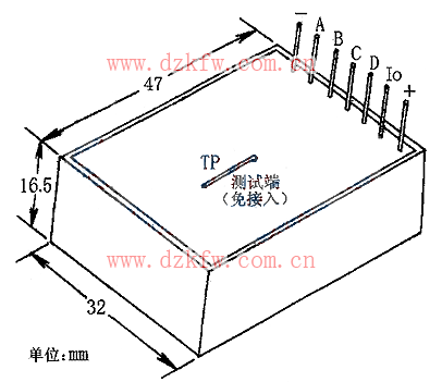 接收模塊外形及引腳排列如下圖所示,其體積約為47mm×32mm×16.5mm,內(nèi)有超再生式高頻接收電路、信號(hào)檢出及處理電路、譯碼電路等,可直接輸出互鎖的四路(A、B、C、D端)高電平信號(hào)和一路(IO端)非鎖存正脈沖信號(hào)。