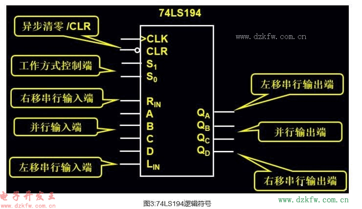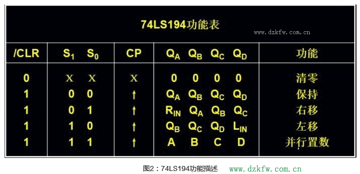 移位寄存器是指寄存器中所存的代碼能夠在移位脈沖的作用下依次左移或右移。74LS194是一個4位雙向移位寄存器,最高時鐘脈沖為36MHZ