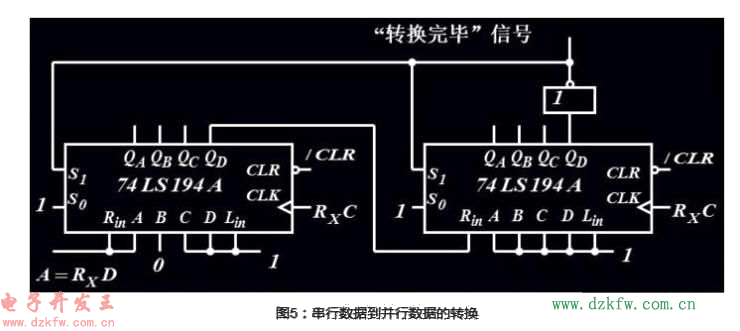 如果把圖4中的QA的輸出變為非,則為扭環形移位器。當然,也可以利用194完成串行數據到并行數據的轉換(這種轉換的本質是:輸入數據一位一位讀取,而輸出數據則一次讀取),如下圖5所示: