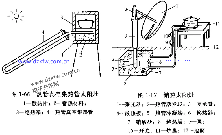 (2) 儲熱太陽灶。圖1-67是蓄熱太陽灶、太陽光通過聚光器1,將光線聚集照射到熱管蒸發段2,熱量通過熱管迅速傳導到熱管冷凝端5,通過散熱板4再將它傳給換熱器6中的硝酸鹽,再用高溫泵9和開關10使其管內傳熱介質把硝酸鹽獲得的熱量傳緥爐盤11,利用爐盤所達到的高溫進行炊事操作。