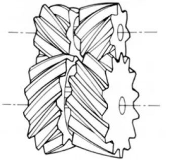齒線為左旋及右旋的兩個斜齒齒輪組合而成的齒輪。有在軸向不產(chǎn)生推力的優(yōu)點。