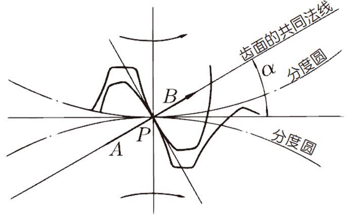 A齒在節(jié)點上推動B點。這個時候的推動力作用在A齒及B齒的共同法線上。也就是說,共同法線是力的作用方向,亦是承受壓力的方向,α則為壓力角。