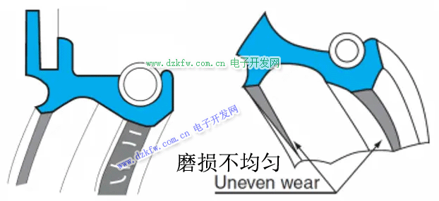 當(dāng)油封存在潤(rùn)滑不良、工作在超出其使用范圍的條件、旋轉(zhuǎn)線速度過(guò)高、內(nèi)部壓力過(guò)高等情況下,可能出現(xiàn)唇口的嚴(yán)重磨損。如果存在扭曲變形、受力不均、振動(dòng)跳動(dòng)超差,也會(huì)出現(xiàn)唇口磨損不均勻現(xiàn)象。