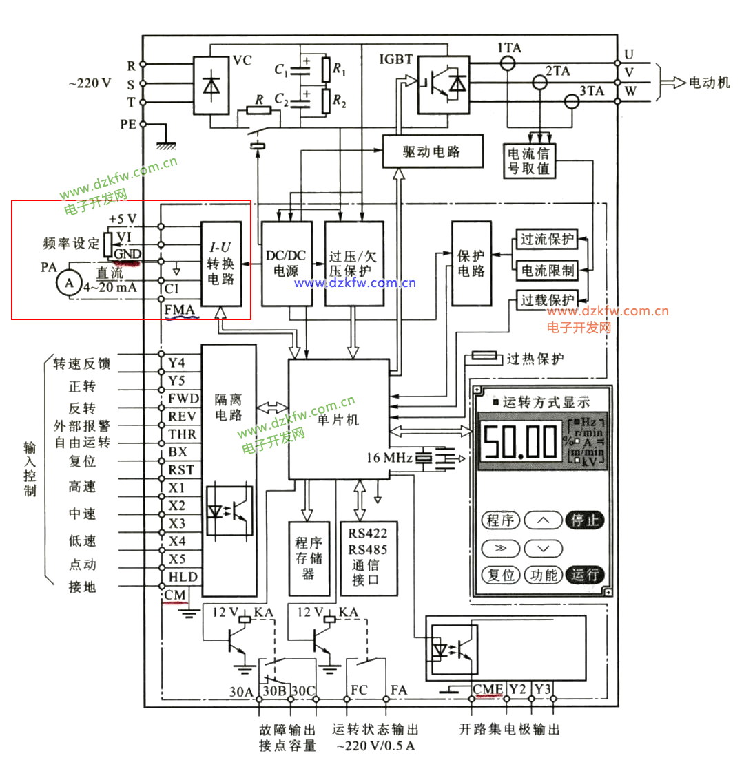 整流電路、起動保護、濾波電路、逆變電路 、指示電路 、制動單元 、輸入端子、 輸出端子。