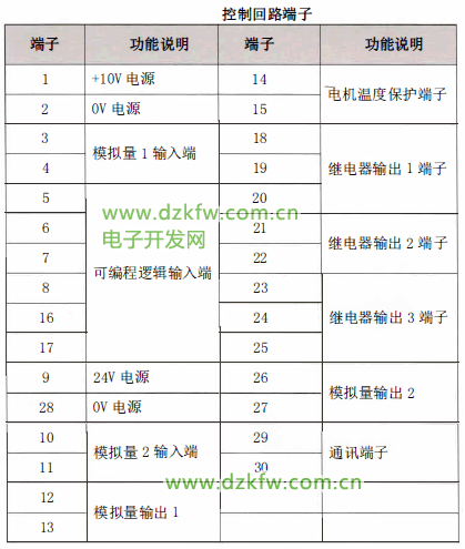 變頻器的控制電路工般包括輸入電路、輸出電路和輔助接口等部分,輸入電路接收控制器(PLC)的指令信號(開關量或模擬量信號),輸出電路輸出變頻器的狀態信息(正常時的開關量或模擬量輸出、異常輸出等),輔助接口包括通信接口、外接鍵盤接口等。通用變頻器是一種智能設備,其特點之一-就是各端子的功能可通過調整相關參數的值進行變更。