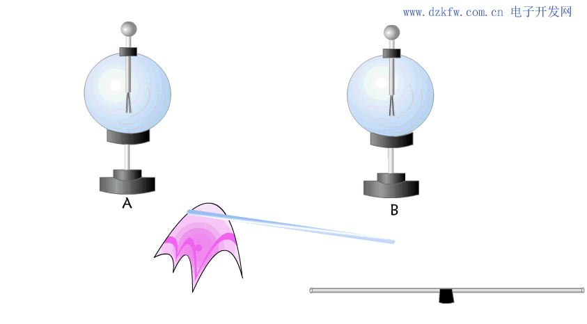 取兩個相同的驗電器A和B,使A帶電,B不帶電。可以看到A的金屬箔張開,B的金屬箔閉合。如圖,
