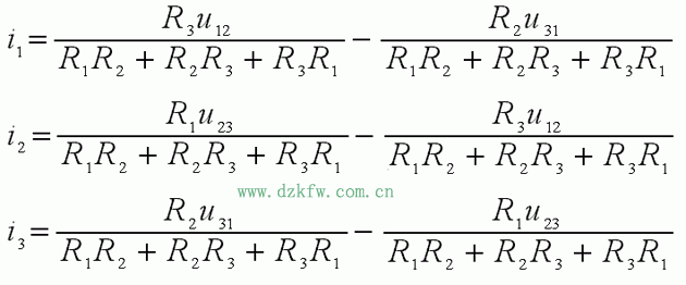 - 對(duì)于任何的u12,u23,u31,上式都要成立,只能是其系數(shù)等于 0 ,由此解得Y-△的等效電阻公式: