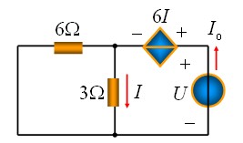 根據(jù)電路聯(lián)接關(guān)系,得到U=6I+3I=9I(KVL),I=I0´6/(6+3)=(2/3)I0(并聯(lián)分流),所以U=9´(2/3)I0=6I0,Req=U/I0=6Ω