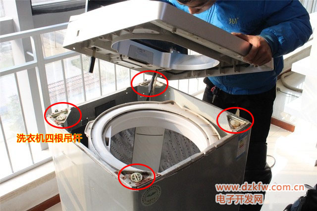 (3)檢查水桶上的四個吊桿是否一致,應(yīng)調(diào)整一致。彈簧彈力是否一樣,如果彈力不一樣,應(yīng)更換彈力一致的新彈簧。有的洗衣機(jī)水桶上部為防止水桶在脫水時擺動幅度太大,都設(shè)置有固定防護(hù)帶,防護(hù)帶上還有拉力彈簧,如果防護(hù)帶太松或彈簧老化失去彈力,應(yīng)條緊或更換新彈簧。