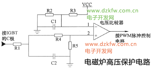 電磁爐高壓保護(hù)電路的作用是保護(hù)IGBT的C極電壓不超過它的耐壓值,防止IGBT過電壓損壞。該電路主要由電壓比較器、外圍電阻、外圍電容構(gòu)成。其 工作原理如下: