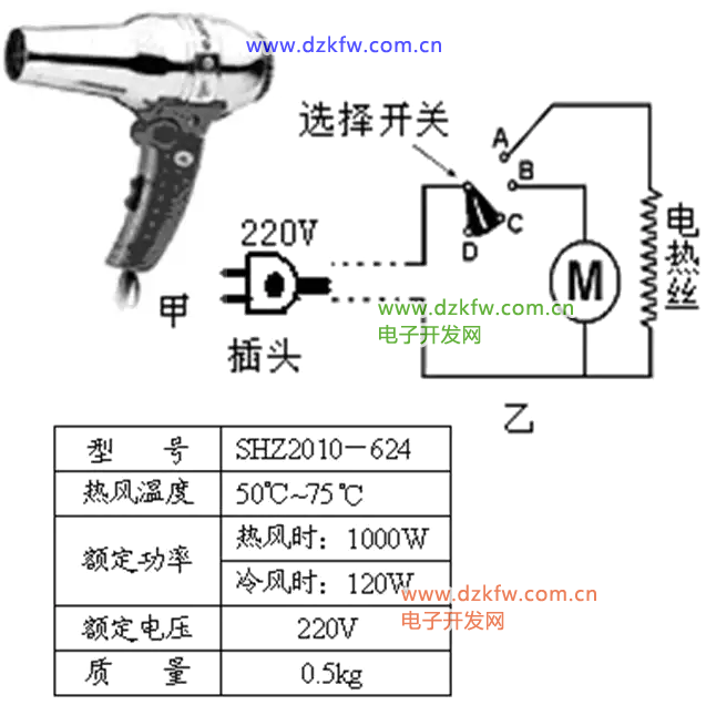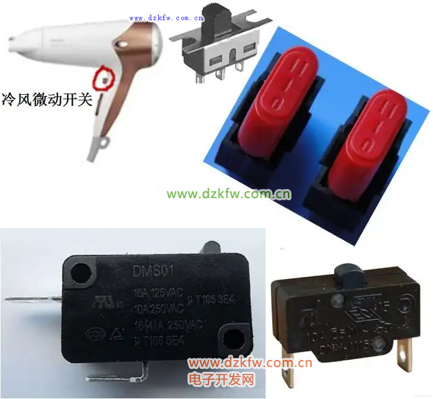1、有的吹風機的電熱元件由二段或者三段電熱絲組成,用來調節溫度,由選擇開關控制。
