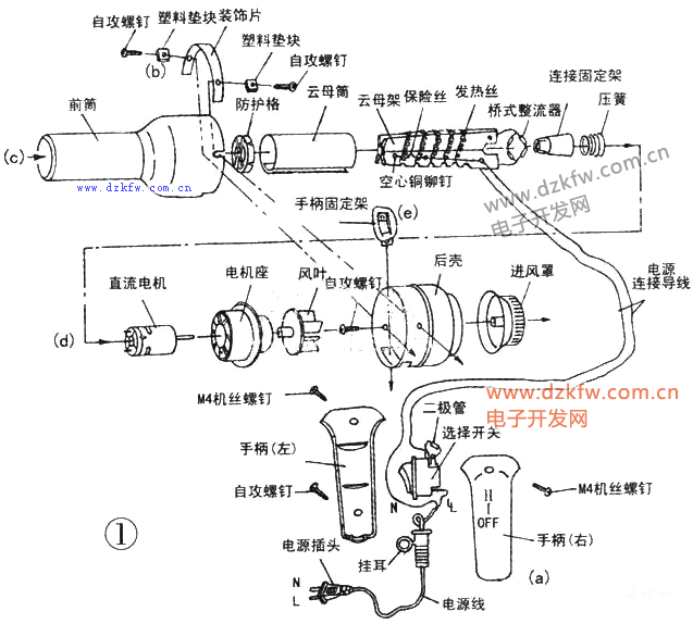 吹風機的種類雖然很多,但是結構大同小異,都是由殼體、手柄、電動機、風葉、電熱元件、擋風板、開關、電源線等組成。
