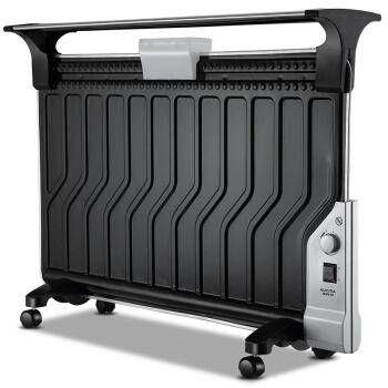 電暖器工作時,當接通電源后,電熱管周圍的導熱油被加熱、升到腔體上部,沿散熱管或散熱片對流循環,通過腔體壁表面將熱量輻射出問去,從而加熱空間環境。被空氣冷卻的導熱油下降到電熱管周圍又被加熱,開始新的循環。