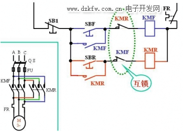 說明:正轉時,其接觸器常閉接點切斷反轉控制回路,SBR不起作用;反之亦然。從而避免兩接觸器同時工作造成主回路短路。
