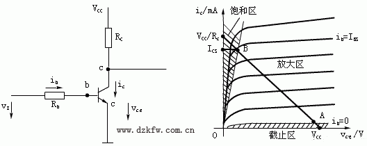圖2給出了一個簡單的NPN晶體三極管共射極開關(guān)電路和對應(yīng)的輸出特性曲線。