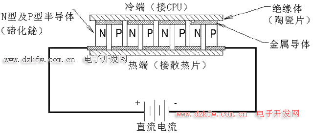 致冷器件是由半導(dǎo)體所組成的一種冷卻裝置,隨著近代的半導(dǎo)體發(fā)展才有實(shí)際的應(yīng)用,也就是致冷器的發(fā)明。其工作原理是由直流電源提供電子流所需的能量,通上電源后,電子負(fù)極(-)出發(fā),首先經(jīng)過P型半導(dǎo)體,于此吸熱量,到了N型半導(dǎo)體,又將熱量放出,每經(jīng)過一個(gè)NP模塊,就有熱量由一邊被送到令外一邊造成溫差而形成冷熱端。冷熱端分別由兩片陶瓷片所構(gòu)成,冷端要接熱源,也就是欲冷卻之。在以往致冷器是運(yùn)用在CPU的,是利用冷端面來冷卻CPU,而熱端面散出的熱量則必需靠風(fēng)扇來排出。致冷器也應(yīng)用于做成車用冷/熱保溫箱,冷的方面可以冷飲機(jī),熱的方面可以保溫?zé)岬臇|西。