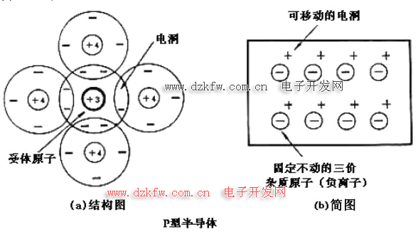 (1) 如果在鍺或硅中均勻摻雜三價(jià)元素,由于價(jià)電子間會(huì)互相結(jié)合而形成共價(jià)鍵,故每個(gè)三價(jià)元素會(huì)與鄰近四價(jià)之鍺或硅原子互成一共價(jià)鍵,而多缺少一個(gè)電子,在原子中造成一個(gè)空缺來,這個(gè)空缺我們稱為電洞,如圖(5)B 所示,加入三價(jià)元素之半導(dǎo)體就稱為P型半導(dǎo)體。(P表示posiTIve,電洞視為正電荷) 。